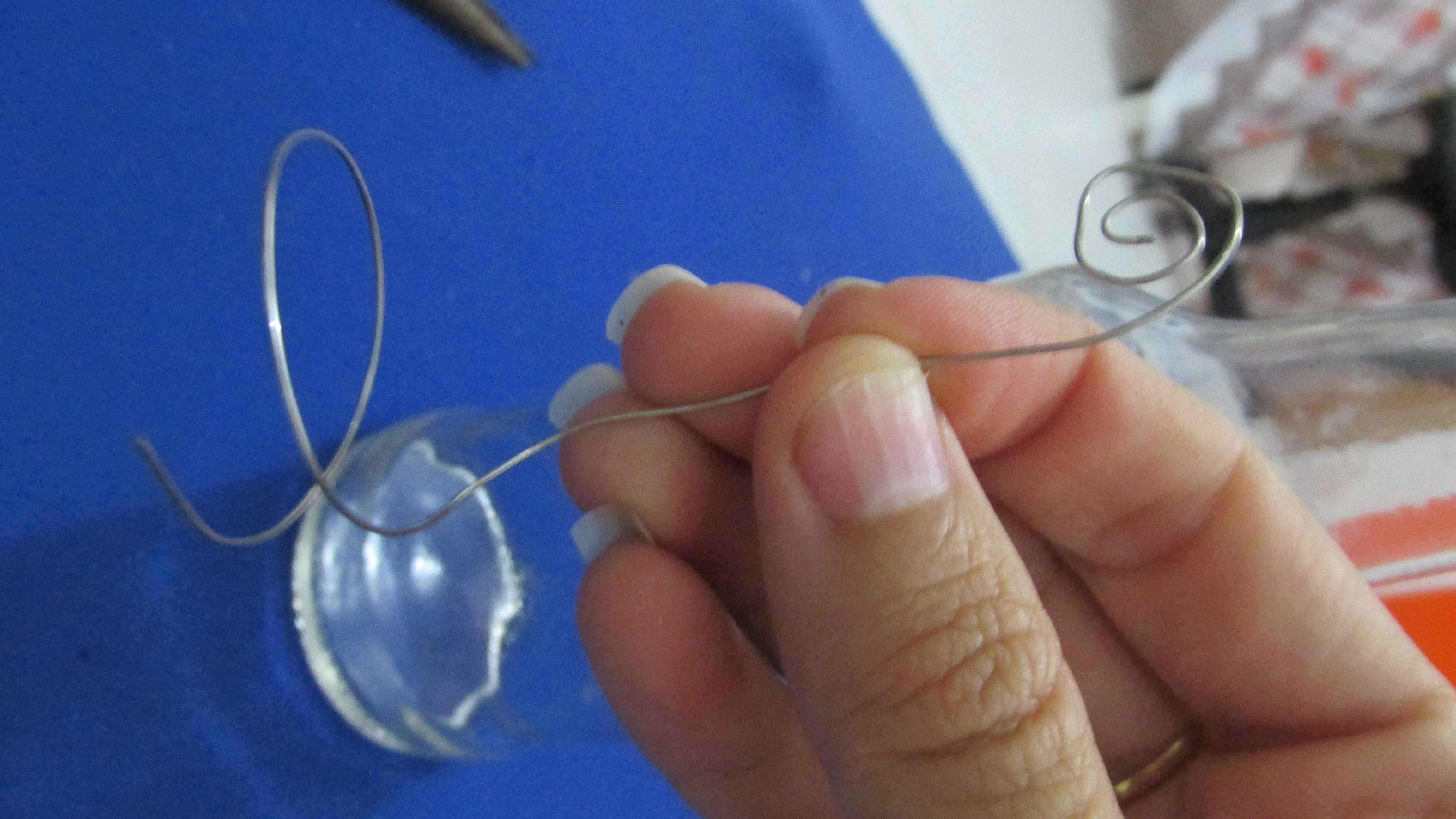 Agora vou pegar um pedaço de arame (30cm), e com um alicate vou enrolar uma das extremidades para o encaixe da foto. Na outra extremidade, enrolo na boca da garrafa (com o dedo mesmo). Ficando dessa maneira: