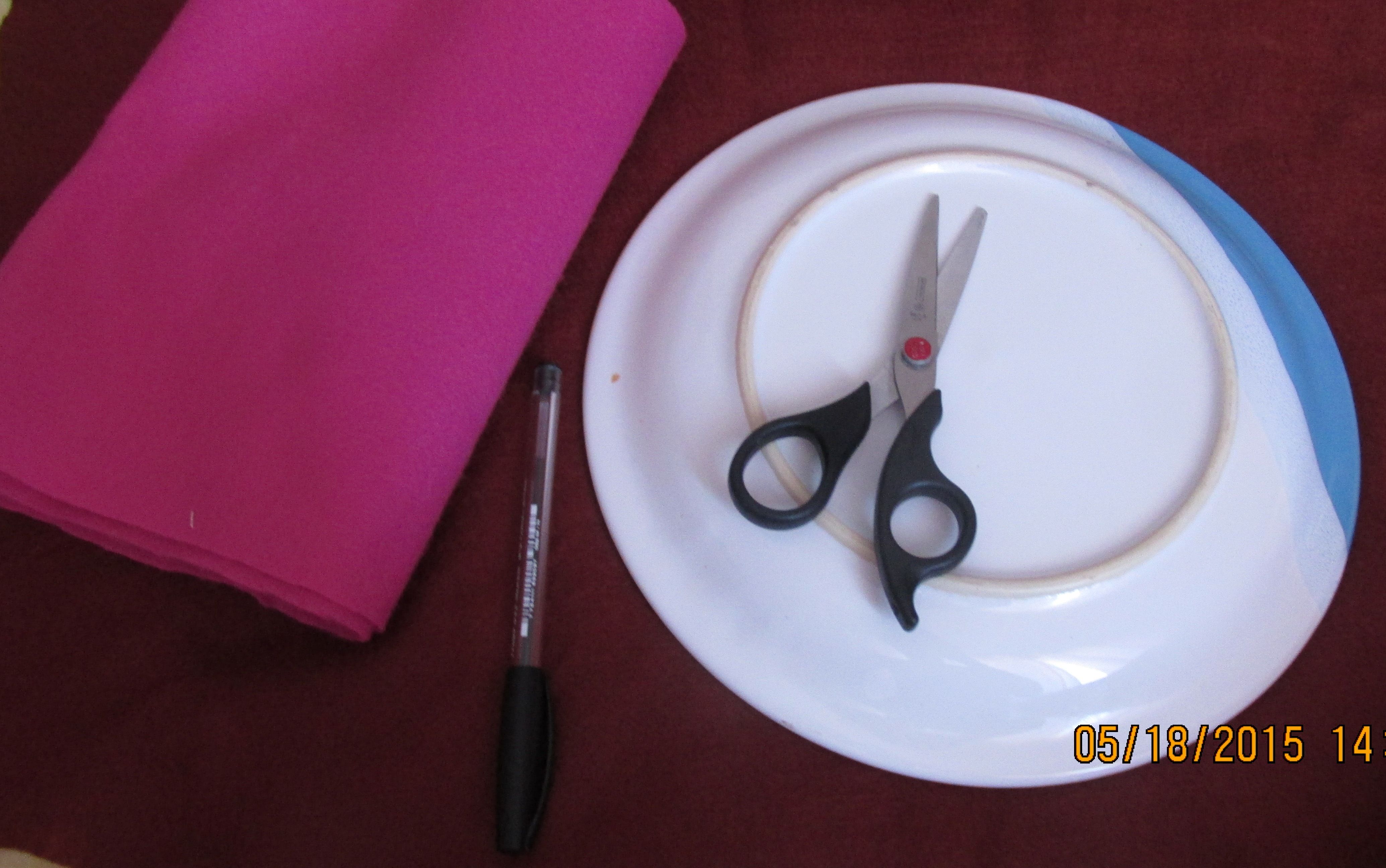 Corte dois círculos (do tamanho das almofadas). Mas o tamanho recomendado é de 40 cm. Após cortar os círculos, vamos dobra-los ao meio.