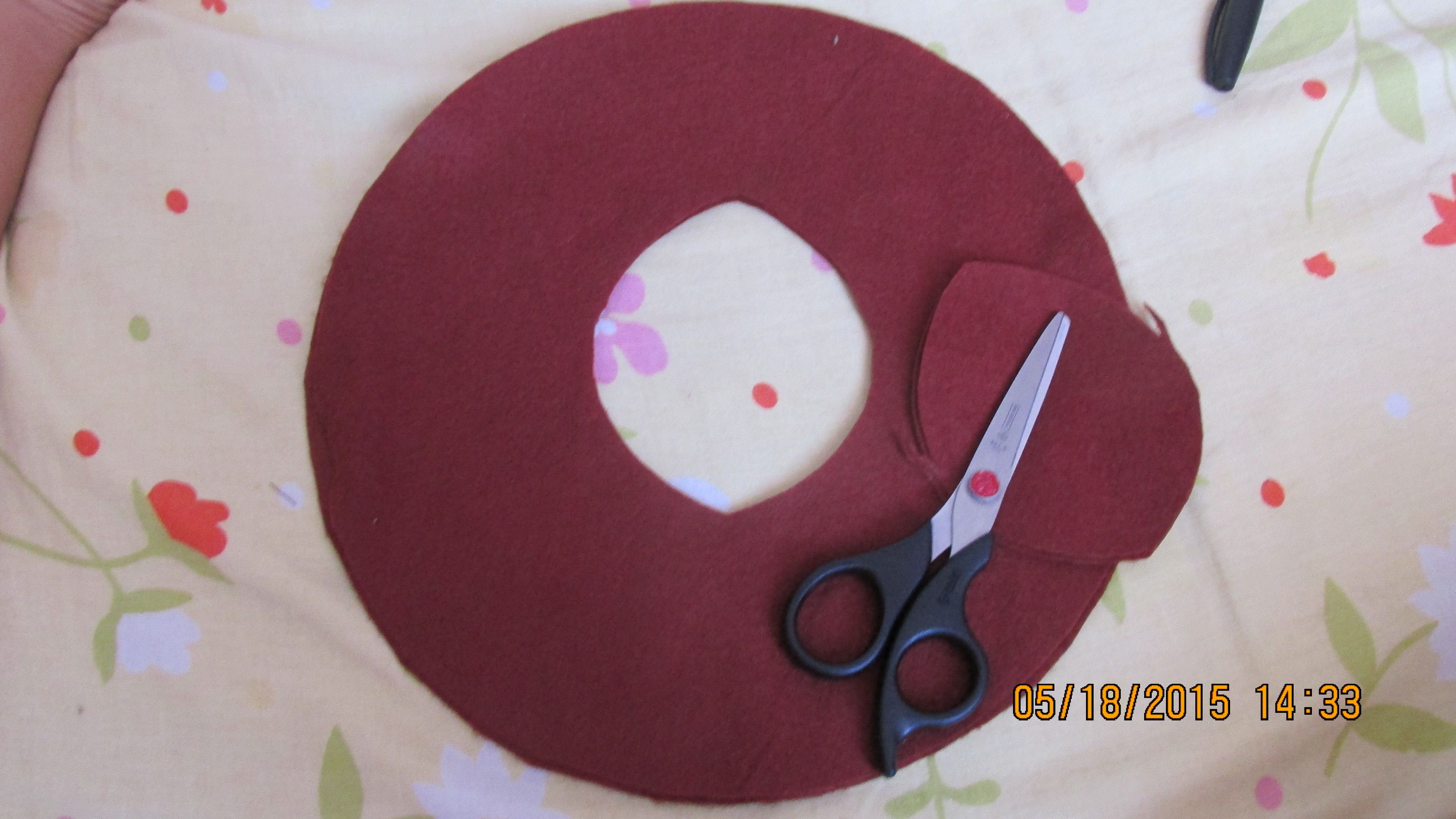 Agora, desenhe uma flor no feltro rosa, corte e cole sob o feltro marrom, que já se encontra costurado e preenchido.