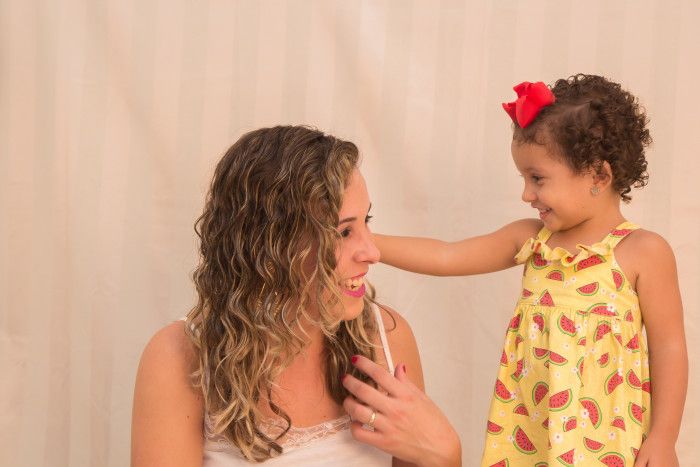 Lembro que quando eu era lisa e ia escovar o cabelocom minha tia, minha filha não via a hora de terminar o meu cabelo para poder fazer o dela. Ela queria, por que queria que minha tia fizesse com ela, igual fez com a mamãe. E é por isso, que minha primeira dica é ser como queremos que nossos filhos sejam .