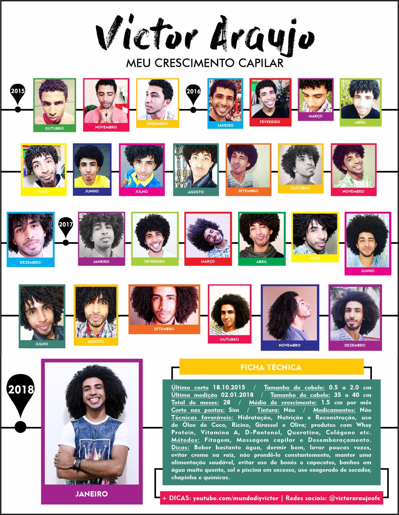 Pensando nisso,decidi trazer para vocês esse post contando um pouco sobre a história do meu cabelo incentivando você garoto e você garota também a revelar sua real beleza assumindo seus cachos ou seu crespo de maneira muito segura e saudável. Segue uma retrospectiva do meu crescimento capilar para te inspirar bastante, e algumas dicas para você realizar seu sonho de ter um cabelão agora em 2018 😉