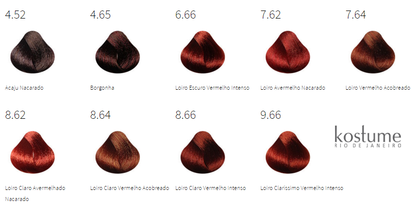 Lá no comecinho do post, vimos um pouco sobre Cores Base e Nuances, e são elas que vão definir o tom de vermelho que você pretende utilizar. Trouxe a tabela de vermelhos da Kostume Kolor (que é a tintura que eu estou utilizando no momento), para mostrar para vocês.