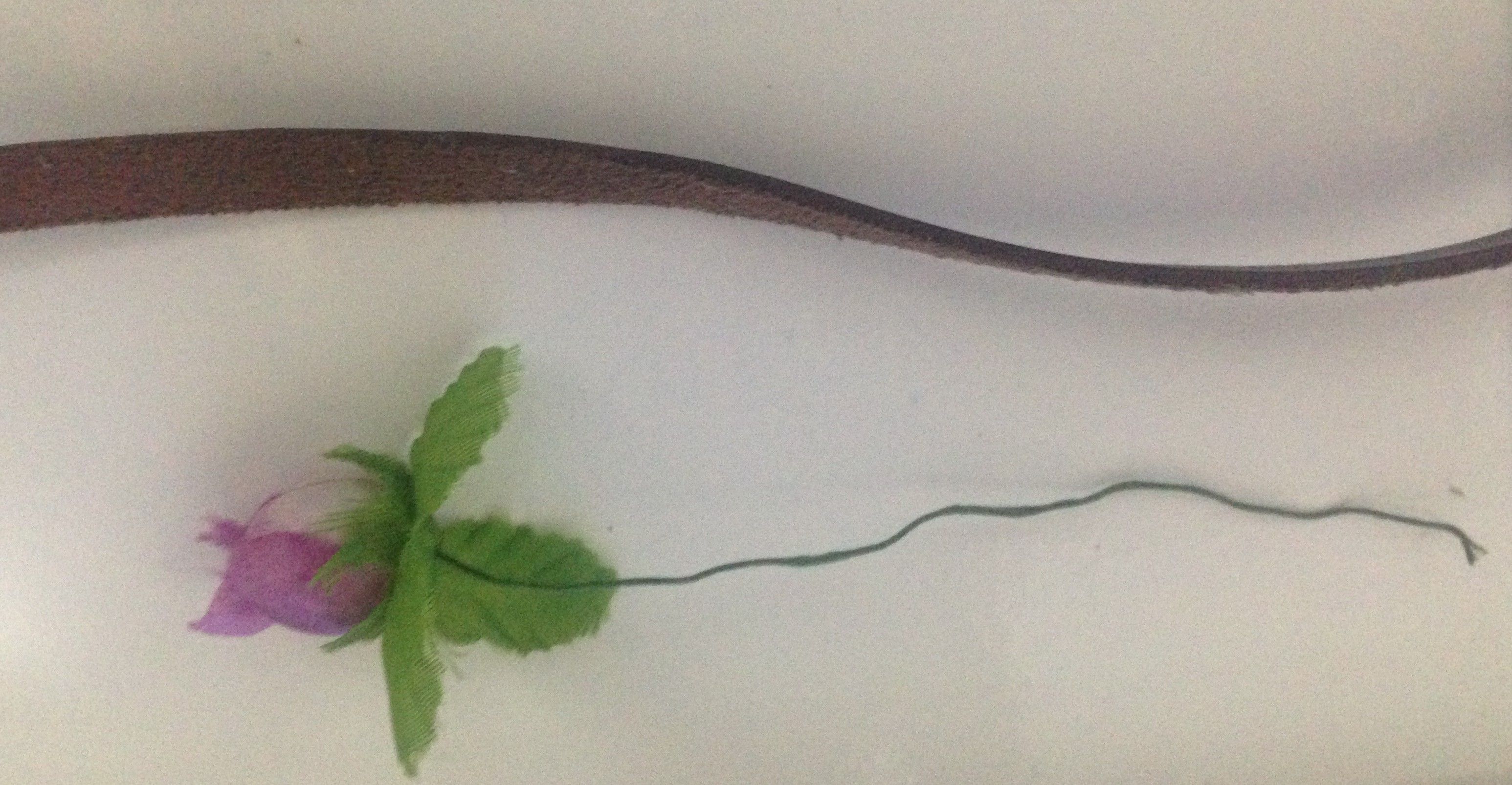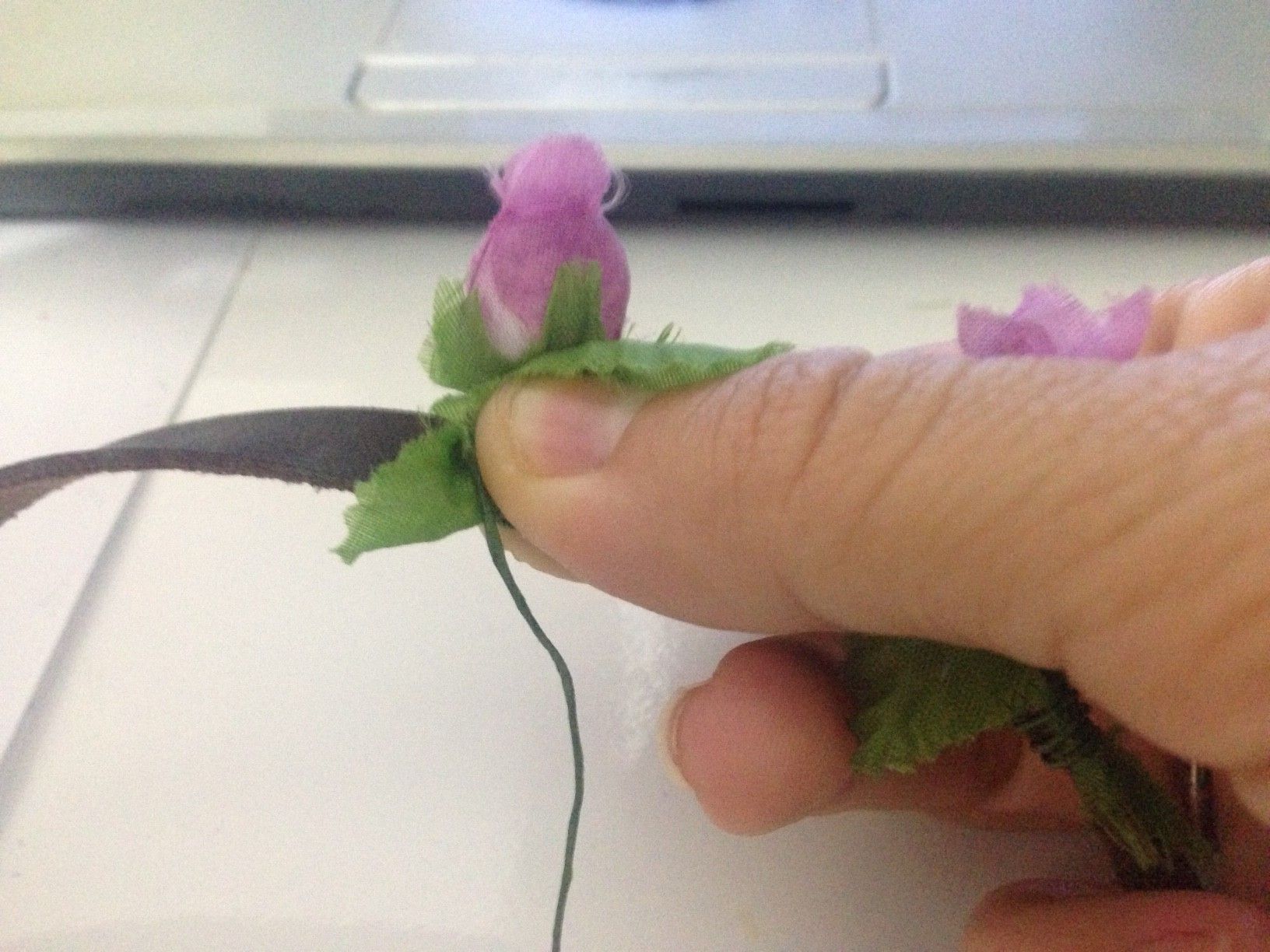 - Só é preciso enrolar o arame da própria flor na tira e deve-se, dá uma distí¢ncia de um dedo de uma flor para outra. Mas é claro que isso depende do modelo que você deseja fazer.