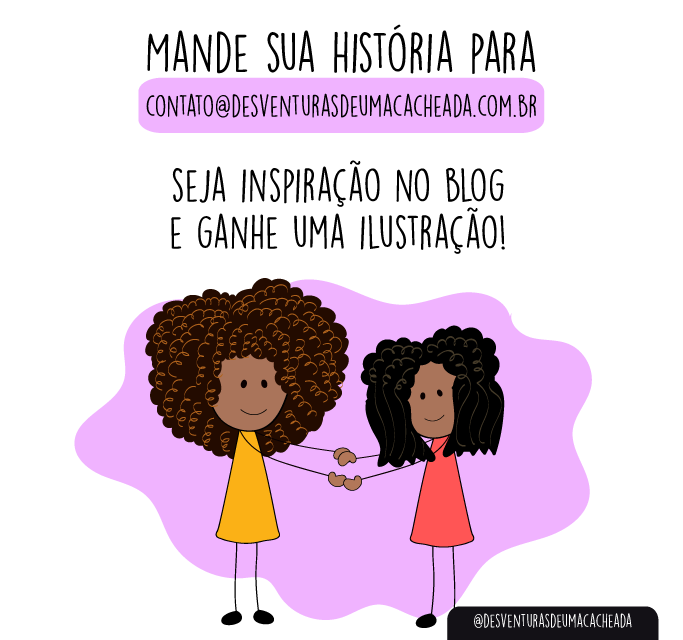 - Já manda sua história para contato@desventurasdeumacacheada.com.br. (Vale contar sobre a história de aceitaçãooooo do seu cabelo, das suas características, do seu corpo! O importante é inspirar outras pessoas e levar essa corrente adiante.
