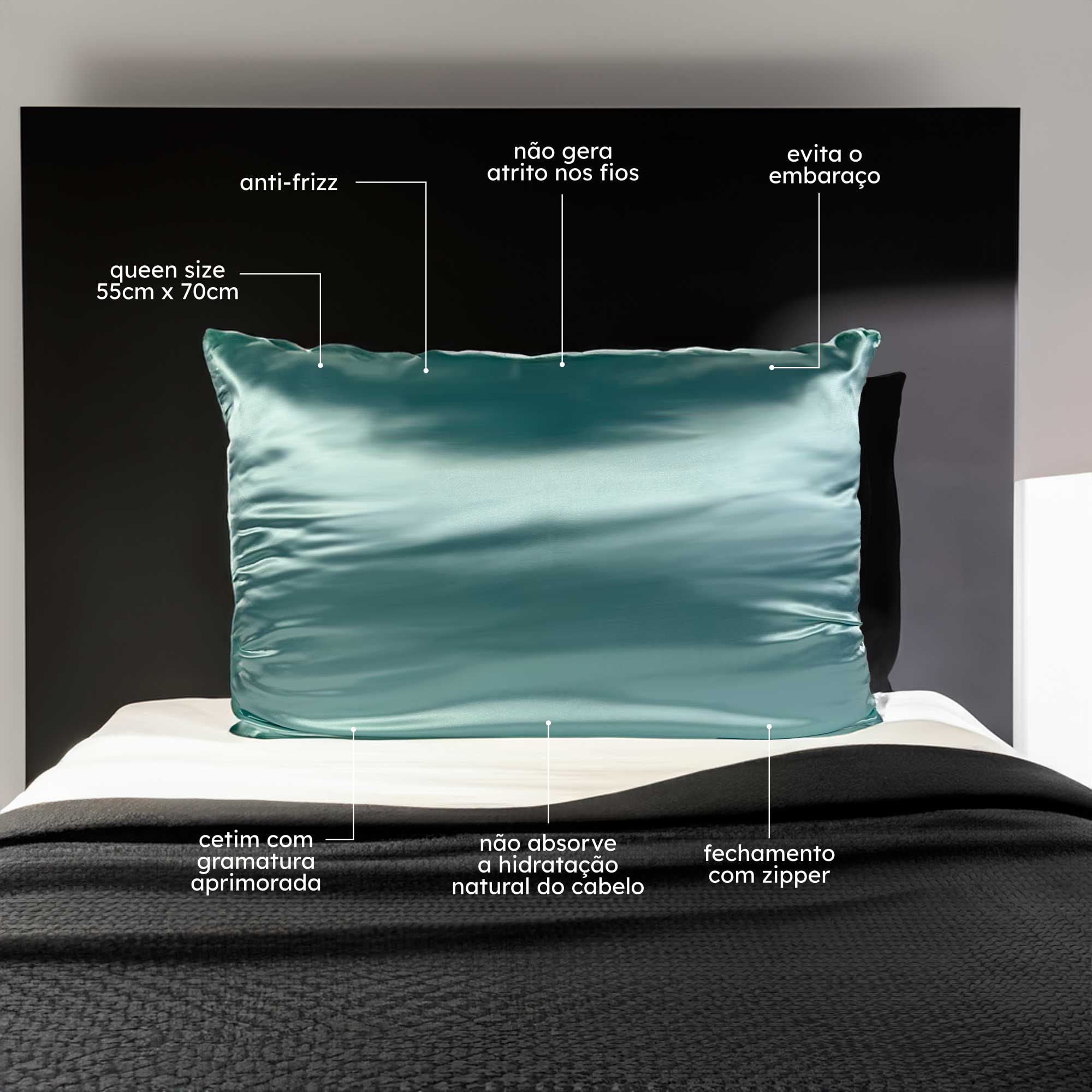 Fronha com ZIPPER Verde Agua de Cetim Anti Frizz – QUEEN SIZE 55X70